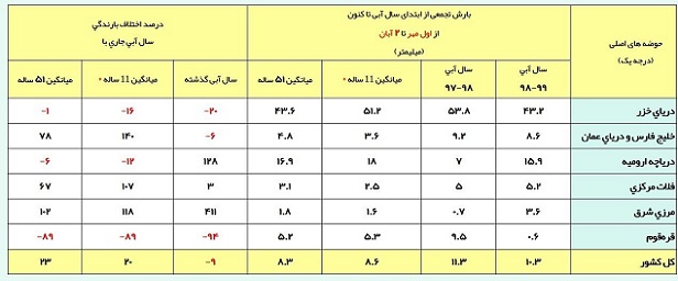 این مقدار بارندگی نسبت به میانگین دورههای مشابه درازمدت (8.3 میلیمتر) 23 درصد افزایش و نسبت به دوره مشابه سال آبی گذشته (11.3 میلیمتر) کاهشی 9 درصدی را نشان میدهد.جدول زیر، وضعیت بارندگی تجمعی حوضههای آبریز درجه یک کشور از اول مهر تا ساعت 18:30 روز دوم آبان سال آبی 99 ــ 98 را نشان میدهد درحالیکه تا چند روز پیش، بارشهای سال آبی جاری در مقایسه با بارشهای مدت مشابه سال قبل، کاهشی بیش از 50 درصد را نشان می داد، با شدت گرفتن بارشها در روزهای اخیر، فاصله حجم بارشها به بارشهای شدید سال آبی قبل نزدیک شده است.