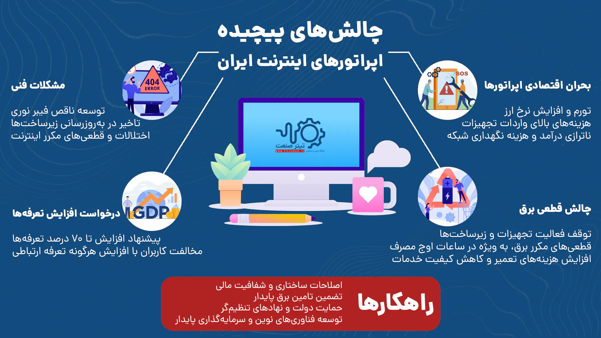 در سال ۱۴۰۴، صنعت ارتباطات و اپراتوری اینترنت ایران بیش از هر زمانی گرفتار دو بحران همزمان شده است؛ نخست فشارهای مالی ناشی از تورم، افزایش نرخ ارز و هزینههای واردات تجهیزات که نقدینگی شرکتها را به شدت محدود کرده و دوم اختلالات گسترده و قطعیهای مکرر اینترنت بدلیل قطعی برق که درآمدها را تحت فشار گذاشته است. این شرایط بحرانی، که از سال گذشته آغاز شده، به زعم کارشناسان، وضعیت ناپایداری ایجاد کرده و آینده این صنعت را مبهم ساخته است.مشکل قطعی برق نیز چالشی اساسی است که به پیچیدگی بحرانها افزوده است. قطعیهای مکرر برق، به ویژه در فصلهای گرم که مصرف انرژی بالاست، باعث توقف فعالیت تجهیزات شبکه و زیرساختهای اپراتورها میشود. این وضعیت نه تنها کیفیت خدمات را کاهش میدهد بلکه موجب افزایش هزینههای تعمیر و نگهداری شده و درآمد اپراتورها را بیش از پیش تحت تاثیر قرار میدهد. در برخی مناطق، قطعیهای برق منجر به قطع سراسری اینترنت و نارضایتی گسترده کاربران شده است که این موضوع فشار مضاعفی بر اپراتورها وارد میکند.