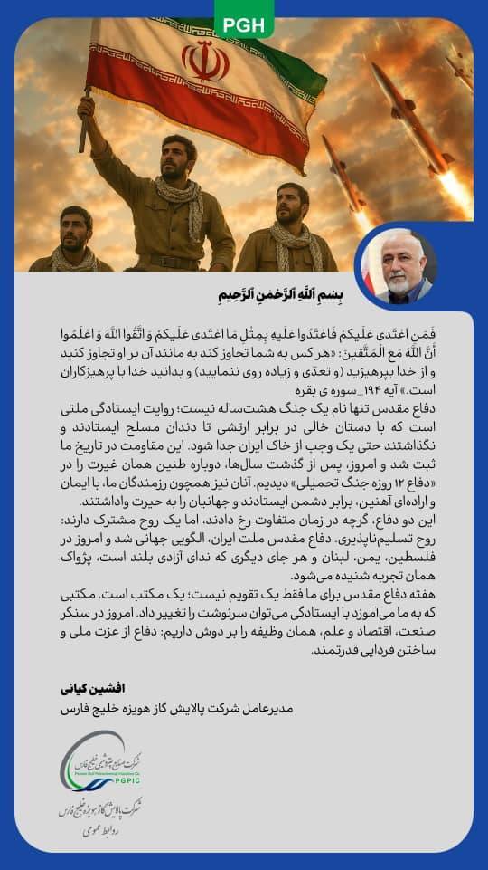 بِسْمِ اللَّهِ الرَّحْمَنِ الرَّحِيمِفَمَنِ اعْتَدی عَلَیکمْ فَاعْتَدُوا عَلَیهِ بِمِثْلِ مَا اعْتَدی عَلَیکمْ وَ اتَّقُوا اللَّهَ وَ اعْلَمُوا أَنَّ اللَّهَ مَعَ الْمُتَّقِینَ: «هر کس به شما تجاوز کند به مانند آن بر او تجاوز کنید و از خدا بپرهیزید (و تعدّی و زیاده روی ننمایید) و بدانید خدا با پرهیزکاران است.» آیه 194_سوره ی بقرهدفاع مقدس تنها نام یک جنگ هشتساله نیست؛ روایت ایستادگی ملتی است که با دستان خالی در برابر ارتشی تا دندان مسلح ایستادند و نگذاشتند حتی یک وجب از خاک ایران جدا شود. این مقاومت در تاریخ ما ثبت شد و امروز، پس از گذشت سالها، دوباره طنین همان غیرت را در «دفاع ۱۲ روزه جنگ تحمیلی» دیدیم. آنان نیز همچون رزمندگان ما، با ایمان و ارادهای آهنین، برابر دشمن ایستادند و جهانیان را به حیرت واداشتند.این دو دفاع، گرچه در زمان متفاوت رخ دادند، اما یک روح مشترک دارند: روح تسلیمناپذیری. دفاع مقدس ملت ایران، الگویی جهانی شد و امروز در فلسطین، یمن، لبنان و هر جای دیگری که ندای آزادی بلند است، پژواک همان تجربه شنیده میشود.هفته دفاع مقدس برای ما فقط یک تقویم نیست؛ یک مکتب است. مکتبی که به ما میآموزد با ایستادگی میتوان سرنوشت را تغییر داد. امروز در سنگر صنعت، اقتصاد و علم، همان وظیفه را بر دوش داریم: دفاع از عزت ملی و ساختن فردایی قدرتمند.
