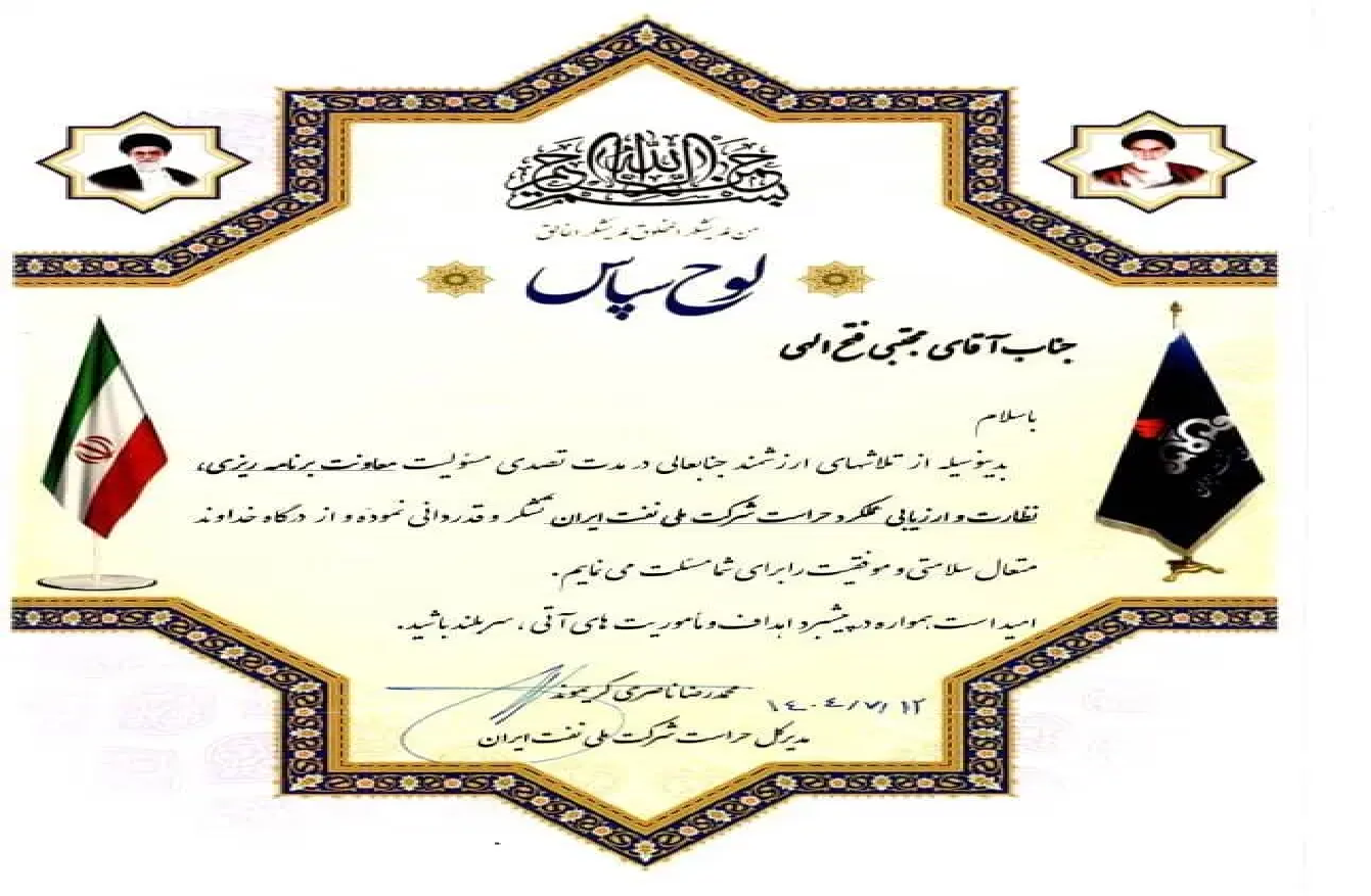 «بدینوسیله از تلاش های ارزشمند جنابعالی در مدت تصدی مسئولیت معاونت برنامه ریزی، نظارت و ارزیابی عملکرد حراست شرکت ملی نفت ایران تشکر و قدردانی نموده و از درگاه خداوند متعال سلامتی و موفقیت را برای شما مسئلت می نمایم.