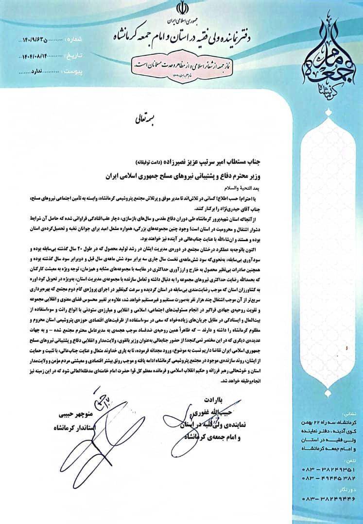 نامه نماینده محترم ولی فقیه و استاندار کرمانشاه به وزیر دفاع/آقای نصیرزاده؛ مافیای فساد و رانت‌خواری، جو پتروشیمی کرمانشاه را متشنج کرده است