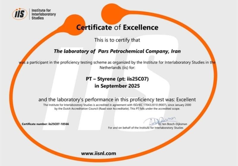به گزارش نبض نفت به نقل از روابط عمومی شرکت پتروشیمی پارس؛ بر اساس گواهی صادره از سوی مؤسسه مطالعات بینآزمایشگاهی (IIS)، آزمایشگاه پتروشیمی پارس در آزمون مهارت PT – Styrene که در سپتامبر ۲۰۲۵ با مشارکت ۳۶ آزمایشگاه از ۱۸ کشور جهان برگزار شد، توانست عملکردی «عالی» از خود به ثبت برساند.