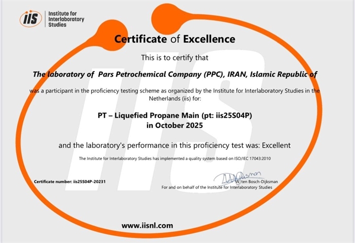 به گزارش نبض نفت، به نقل از روابط عمومی شرکت پتروشیمی پارس؛ بر اساس این گواهینامه، آزمایشگاه پتروشیمی پارس در طرح آزمون مهارتآزمایی پروپان مایع (PT – Liquefied Propane Main) که در اکتبر ۲۰۲۵ برگزار شد، شرکت کرده و عملکرد آن در این آزمون در سطح Excellent (عالی) ارزیابی شده است.