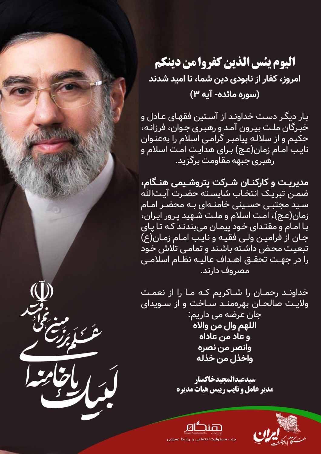 مدیریت و کارکنان شرکت پتروشیمی هنگام، ضمن تبریک انتخاب شایسته حضرت آیتالله سید مجتبی حسینی خامنهای به محضر امام زمان(عج)، امت اسلام و ملت شهید پرور ایران، با امام و مقتدای خود پیمان میبندند که تا پای جان، از فرامین ولی فقیه و نایب امام زمان(ع) تبعیت محض داشته و تمامی تلاش خود را در جهت تحقق اهداف عالیه نظام اسلامی مصروف دارند.